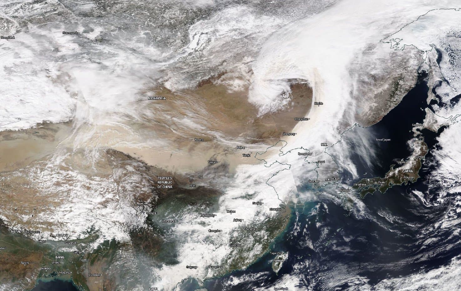 Image satellite du 15 mars 2021 sur la Chine montrant l’importante tempête de poussière sur le pays – Via NOAA
