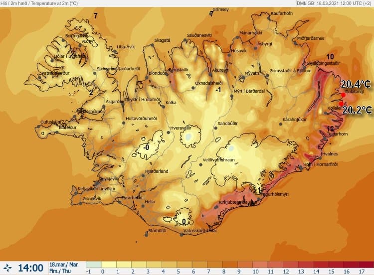 A l’inverse, l’Islande fut touchée le 18 mars dernier par un coup de chaud très inhabituel pour la saison. Grâce à un effet de foehn, les températures se sont envolées sur le Sud-Est du pays avec jusqu’à 20.4°C à Dalatangi (record mensuel pulvérisé, battant les 17.5°C du 27 mars 1956), 20.2°C ont également été atteints à Neskaupstaður. Le record national mensuel du pays a donc été approché de 0.1°C (20.5°C à Kvisker le 29 mars 2012).