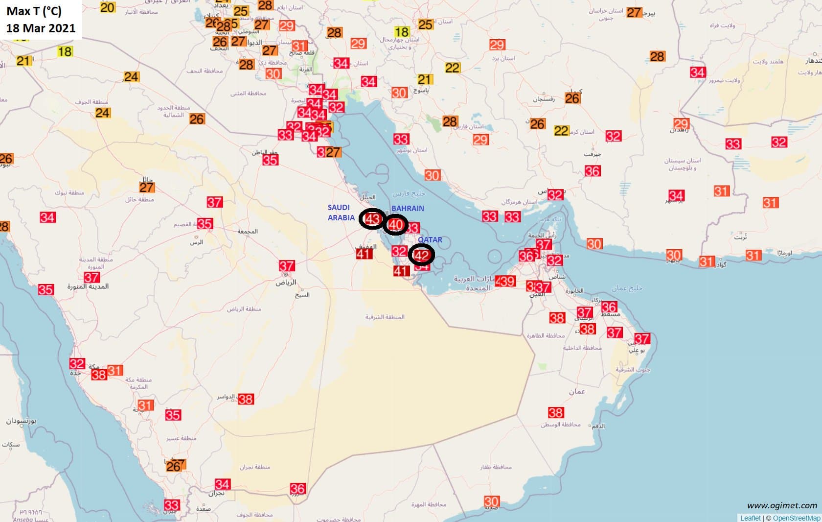 - 42°C à Mesaimeer et 41.5°C à Doha (Qatar), ancien record de 40°C le 12 mars 2021