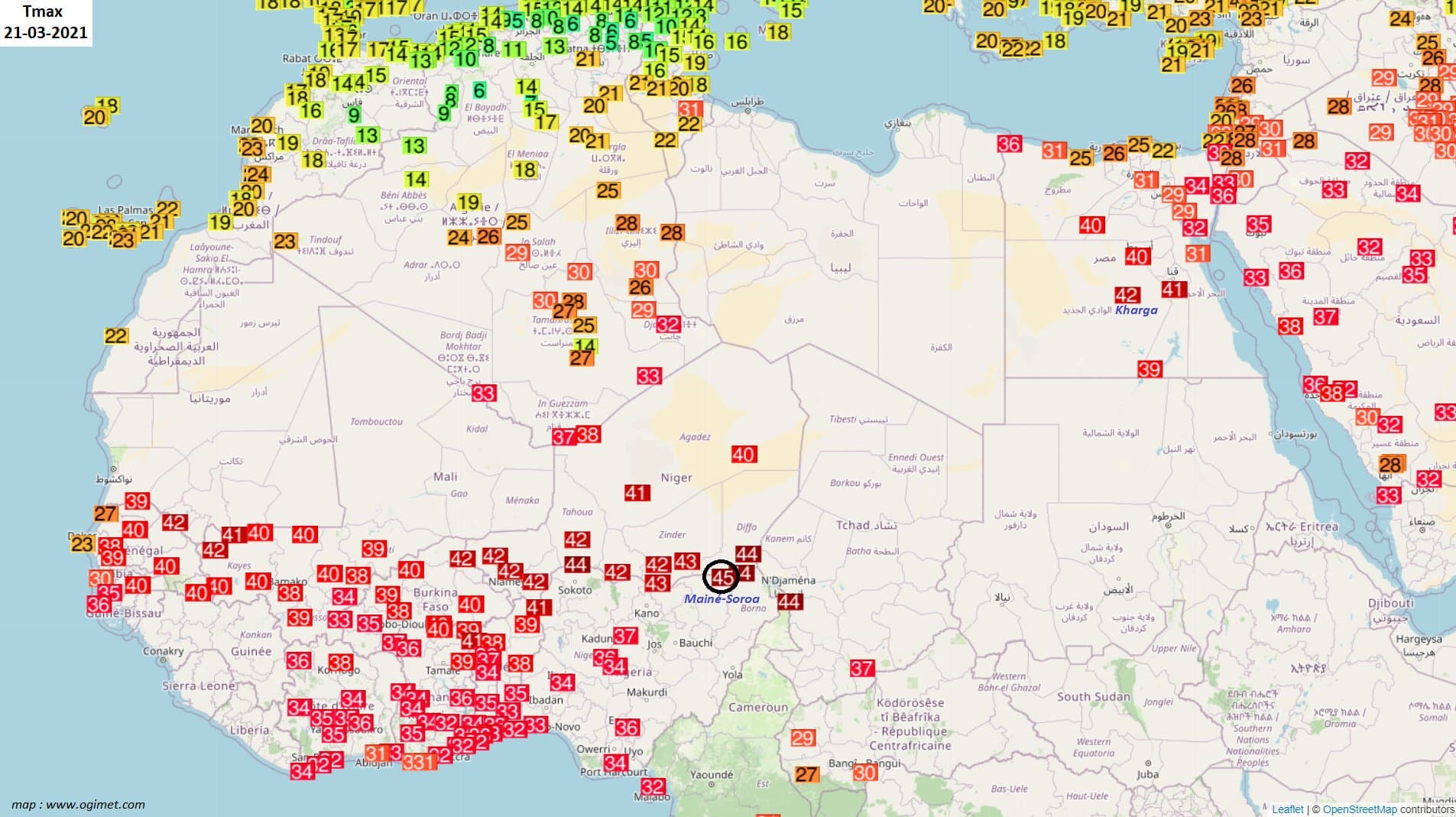 Températures maximales relevées le 21 mars 2021 sur le Nord de l’Afrique – Via Twitter : @EKmeteo