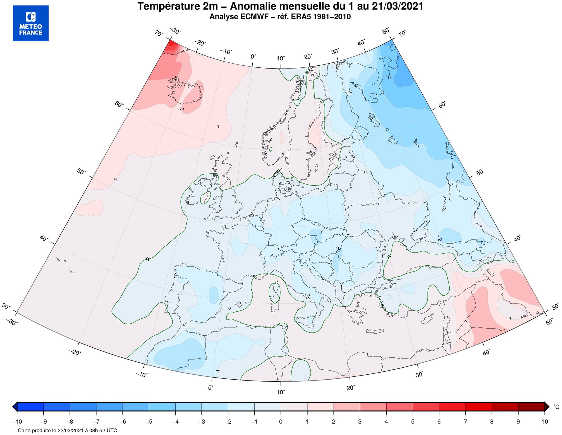 Anomalies de températures du 1er au 21 mars 2021 sur l’Europe - Météo-France