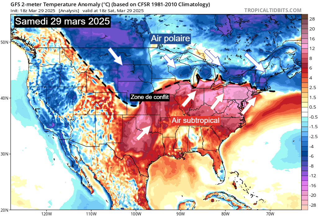 C'est ce qu'il s'est passé en fin de semaine dernière entre le Nord des États-Unis et le Canada avec une masse d'air polaire descendant de l'Arctique et envahissant une large partie du Canada et du Nord des États-Unis rencontrant une masse d'air subtropicale remontant du Mexique.