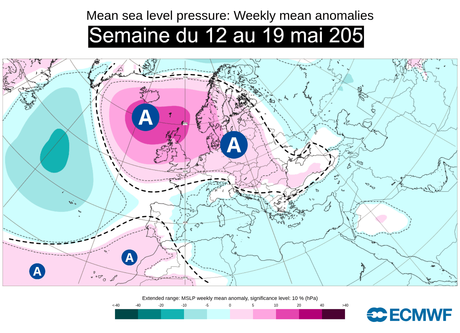 Anomalies de pressions sur l'Europe du 12 au 19 mai 2025 – ECMWF