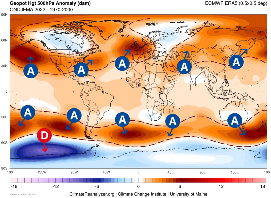 Anomalie de géopotentiels dans le monde d'octobre 2021 à avril 2022 - via climatereanalyzer.org