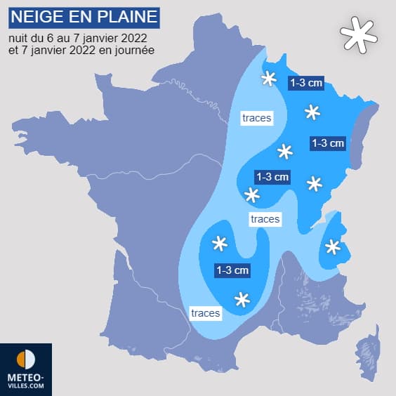 Une perturbation va arriver par la Manche ce soir. Elle s'enfoncera sur le nord et le nord-ouest de la France durant la nuit du 6 au 7 janvier 2022 et finira par se heurter à l'air froid présent sur l'est de l'hexagone. Dès lors, les précipitations se changeront en neige jusqu'en plaine sur un axe allant du Massif Central aux Ardennes. Cette neige, dont les intensités vont rester faibles à modérées, se décalera sur les régions de l'est ce vendredi (entre la Lorraine et le nord des Alpes).