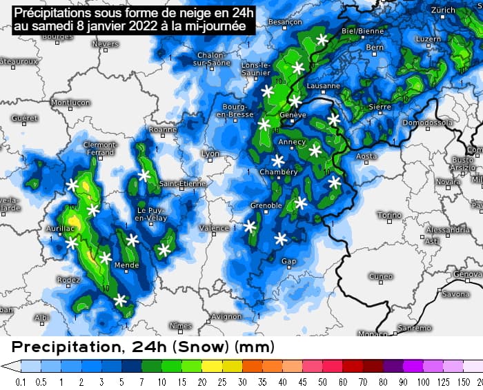 Précipitations neigeuses prévues sur 24h en date du samedi 8 janvier 2022 à midi - via meteologix.com