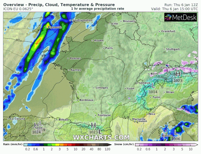 Précipitations du jeudi 6 janvier 2022 au soir jusqu'au vendredi 7 janvier 2022 en après-midi - via wxcharts.com