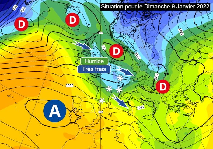 Des conditions très humides vont nous concerner ce week-end des 8 et 9 janvier 2022, en lien avec un rail dépressionnaire venant se positionner entre le Groenland et l'Italie, tandis que l'anticyclone restera cantonné vers les Açores. Cette configuration va nous apporter un flux océanique très humide basculant temporairement au secteur nord-ouest, advectant donc un froid modéré propice à d'importantes chutes de neige sur les massifs.