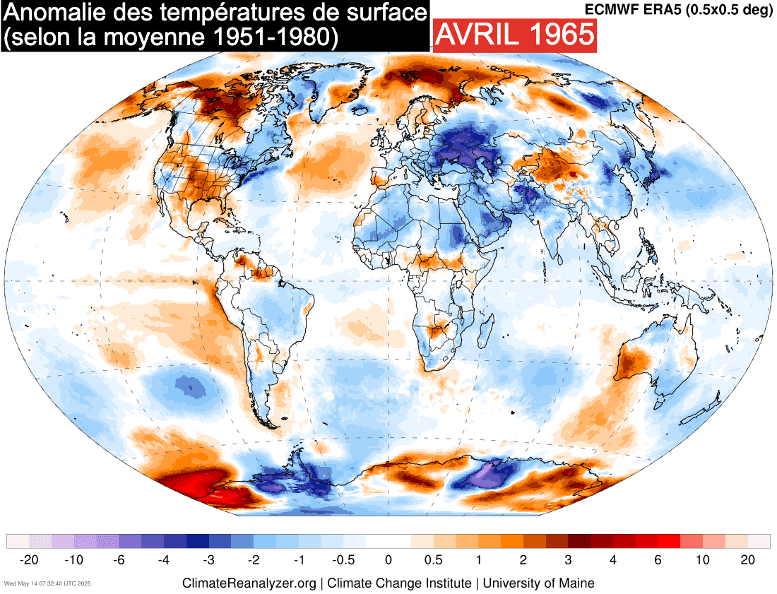 La différence entre avril 1965 et avril 2025 est tellement flagrante que les températures d’avril 2025 sont presque toutes supérieures à celles d’avril 1965 !