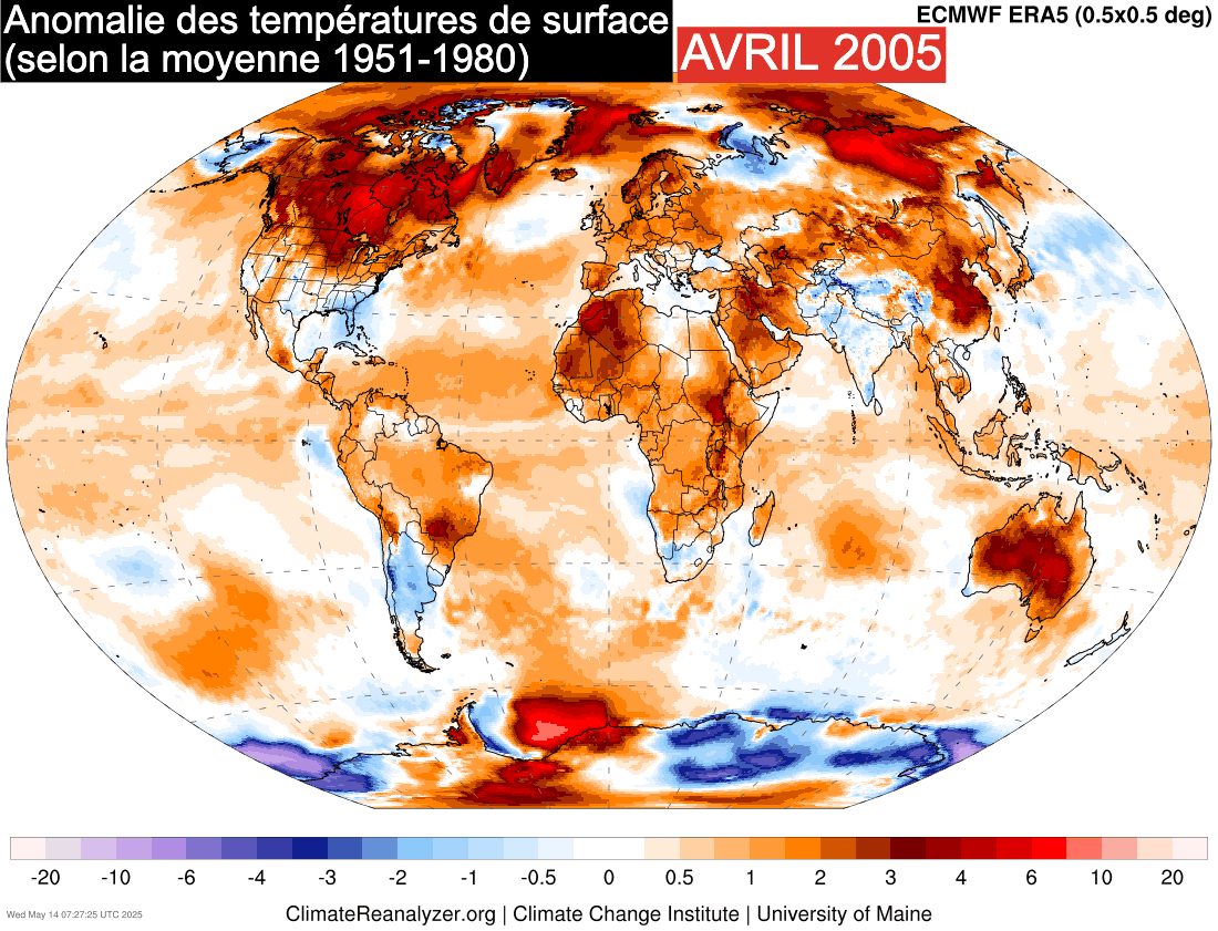 Lorsque l’on compare les anomalies thermique planétaires au niveau régional (et en avril, tous les 20 ans depuis 1965 sur la même période de référence), le constat est sans appel…! Les cartes rougissent de plus en plus, car l’écart à la moyenne des températures sur ces 30 années de référence est de plus en plus grand !