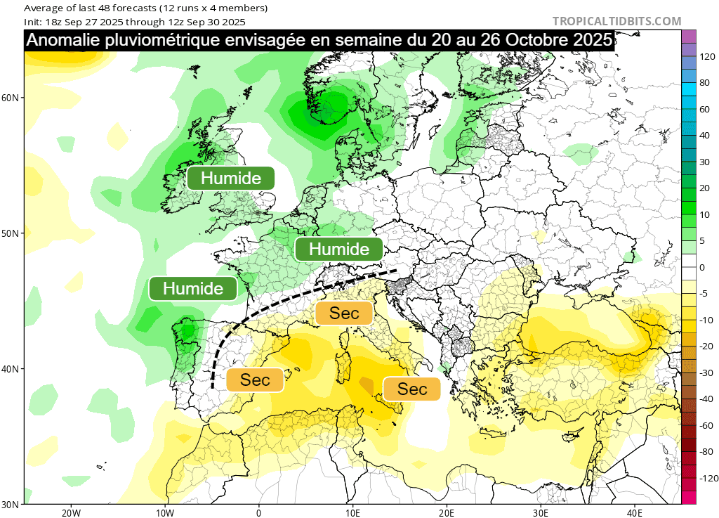 Toutefois, les tendances actuelles envisagent un possible tournant plus humide avant la fin du mois et notamment pour la dernière décade. À partir du 20 octobre 2025, modèles américain comme européen projettent un recul des hautes pressions vers la Méditerranée avec le retour d'une météo plus humide sur une large moitié nord de la France, tandis que les régions méditerranéennes conserveraient un temps sec. Bien évidemment, ces modélisations à long terme sont à prendre avec des pincettes, même si les principaux modèles semblent s'accorder pour le moment.