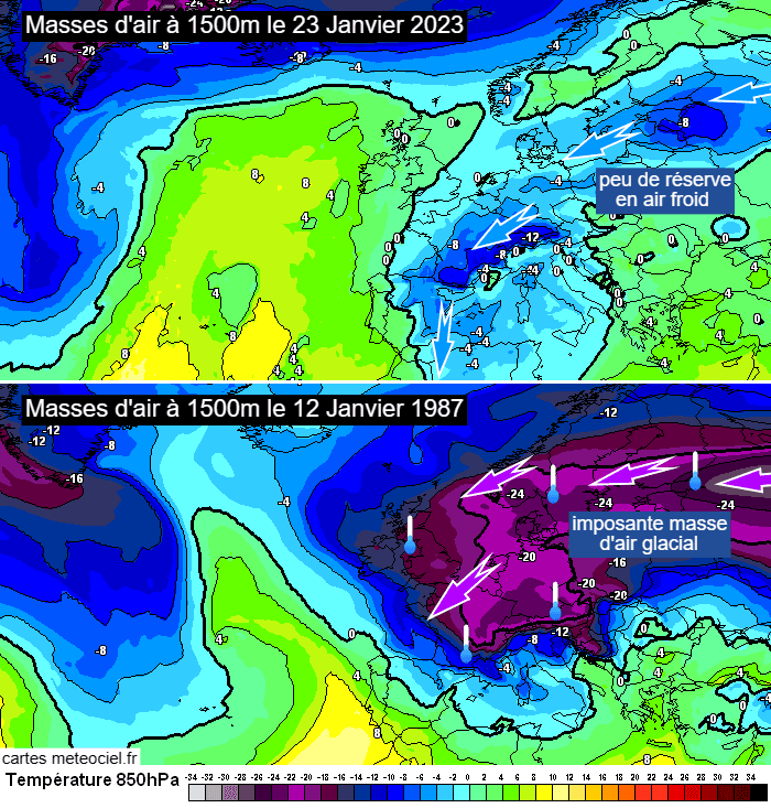 Comparaison des masses d'air à 850 hPa (vers 1500m) les 12 janvier 1987 et 23 janvier 2023 - via meteociel.fr