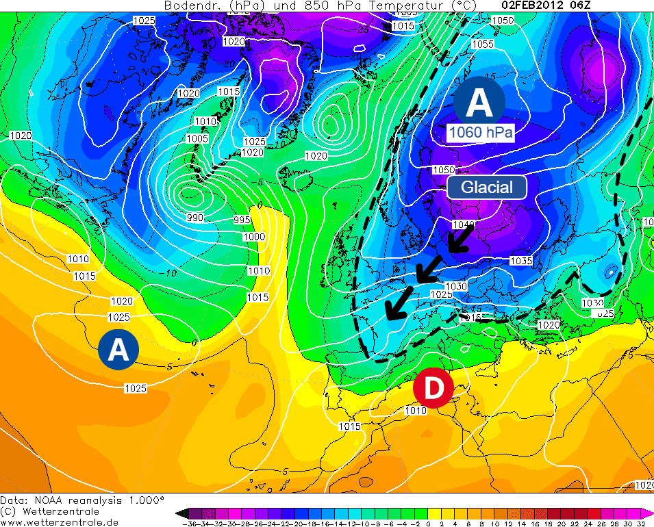 Malgré que cette configuration se soit mise en place à l'ère d'un réchauffement climatique déjà bien avancé, cela n'avait pas empêché des masses d'air particulièrement froid d'arriver jusqu'en France. À l'époque, une réserve d'air glacial particulièrement imposante recouvrait toute l'Europe Centrale, la Scandinavie et l'ouest de la Russie. Entre Rhône-Alpes et l'Alsace, le seuil des -20°C à 850 hPa avait été frôlé début février 2012 (un cran moins froid qu'en janvier 1987) !