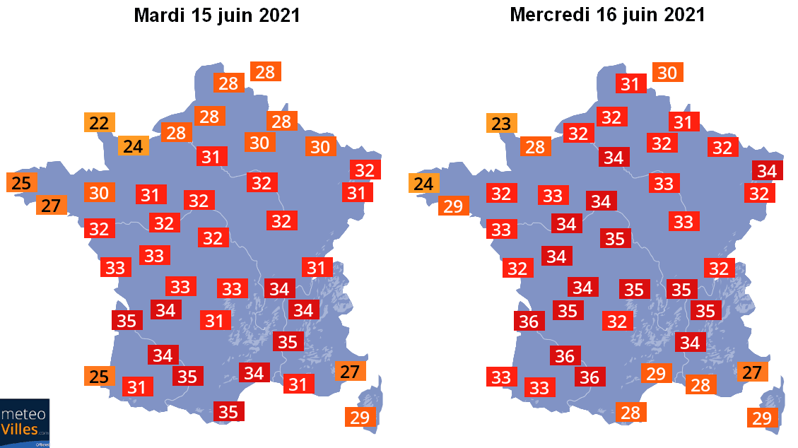 Températures maximales prévues – mardi 15 et mercredi 16 juin 2021 - Météo-Villes