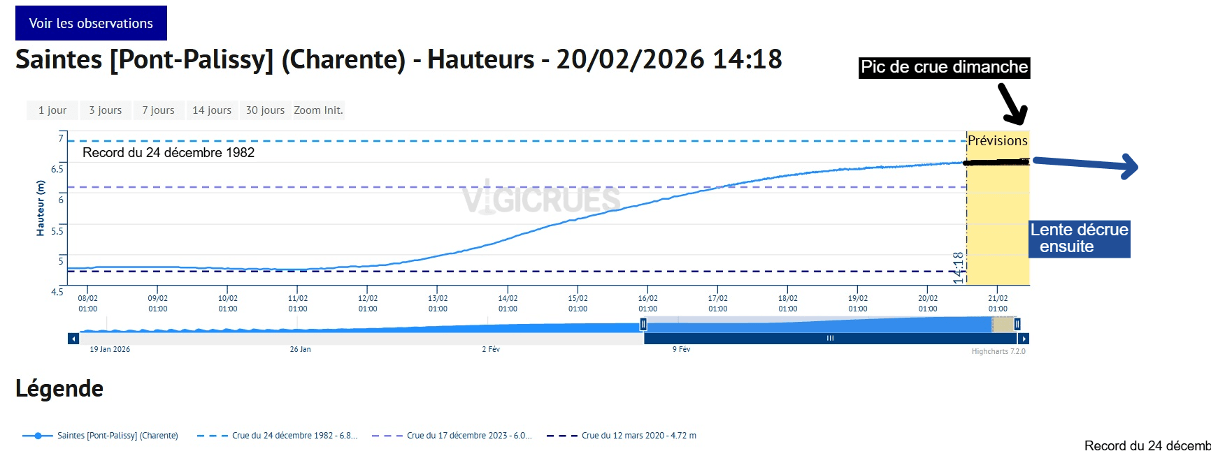 Sur ces secteurs, les niveaux des cours d'eau continuent d'augmenter en cette fin de semaine avant un pic de crue attendu ce week-end. À Saintes par exemple, la Charente devrait atteindre un pic dimanche 22 février autour de 6.55 m (record de 6.84 m en décembre 1982).
