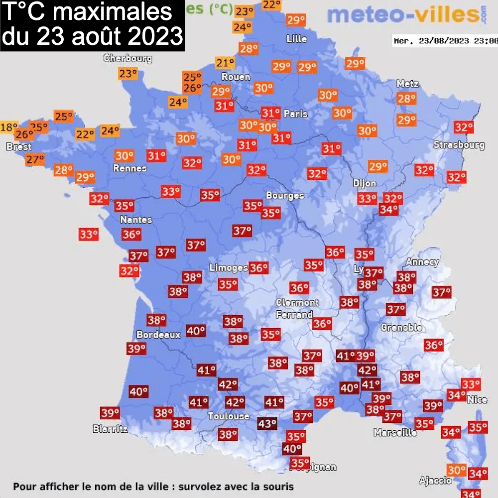 Carte des températures maximales mesurées le 23 août 2023- source : Meteo-villes