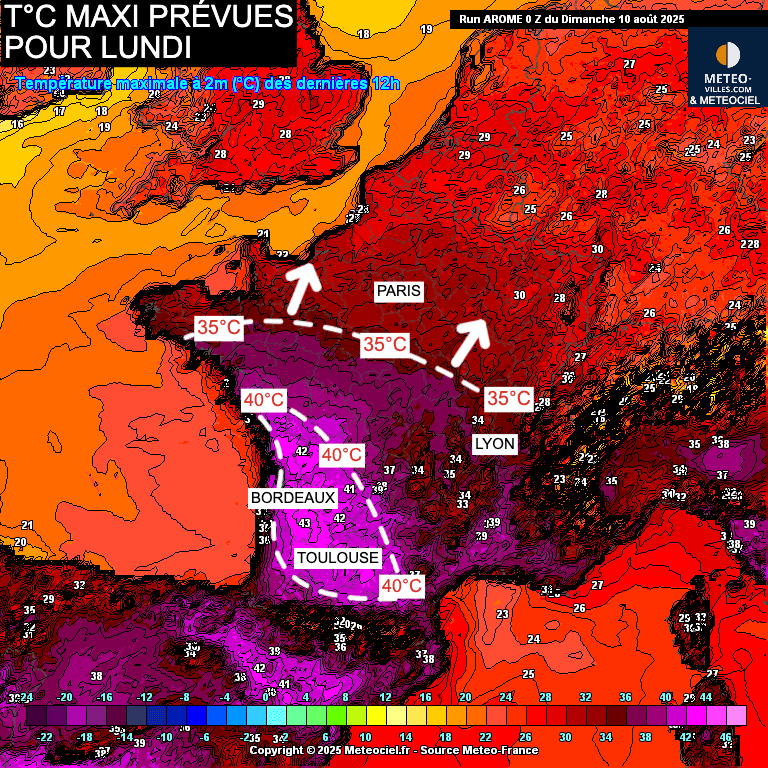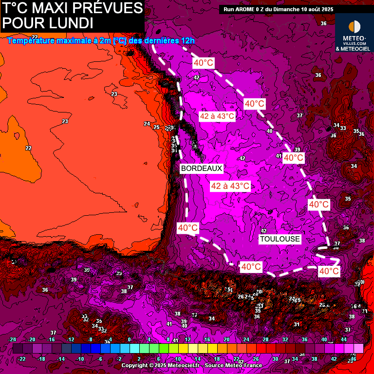 Les 40° seront facilement dépassés entre l’Aquitaine, l’Occitanie et le Poitou-Charentes. Le modèle météo français ARÔME (très précis à courte échéance), envisage même des pointes à 42, 43 et localement 44°C à l'ombre ! Le record absolu en France est de 46,0 °C mesurés à Vérargues dans l'Hérault le 28 juin 2019.