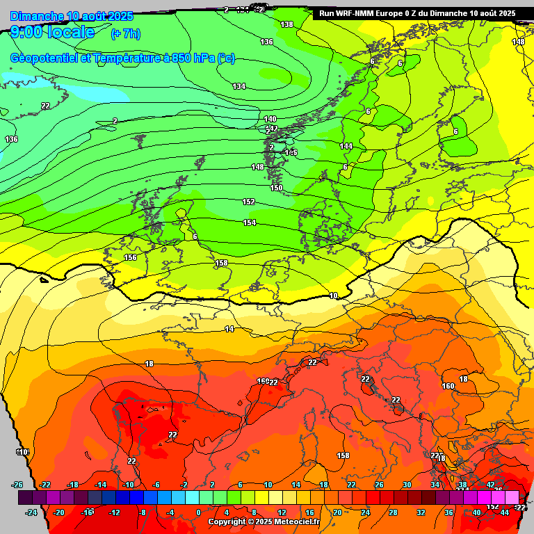 Cartes des masses d'air à 850 hPa du modèle WRF prévues pour lundi et mardi - source : Meteociel