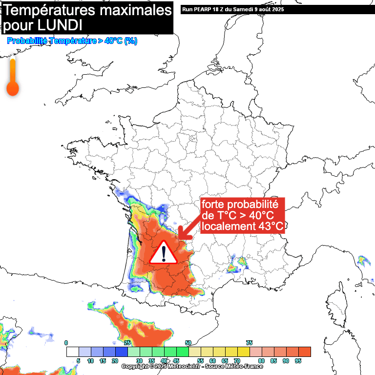 Carte des probabilités que la température dépasse 40°C pour lundi - PEARP - source : Meteociel