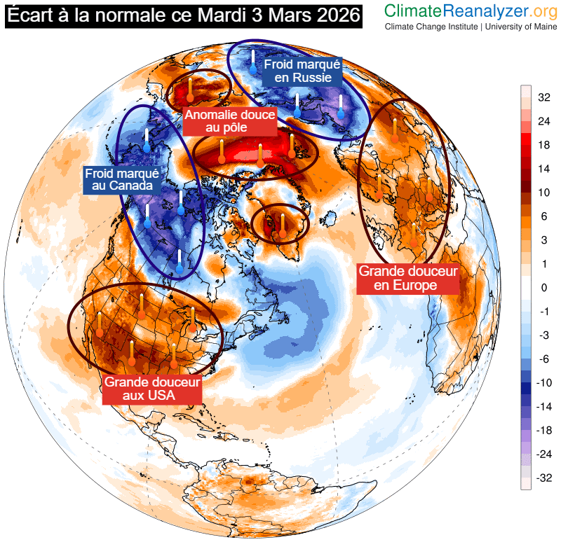 En ce début mars 2026, les contrastes thermiques sont impressionnants dans l'hémisphère nord. Alors qu'un froid polaire concerne le Canada et la Russie, le pôle nord surchauffe et l'Europe est plongée dans une impressionnante douceur.
