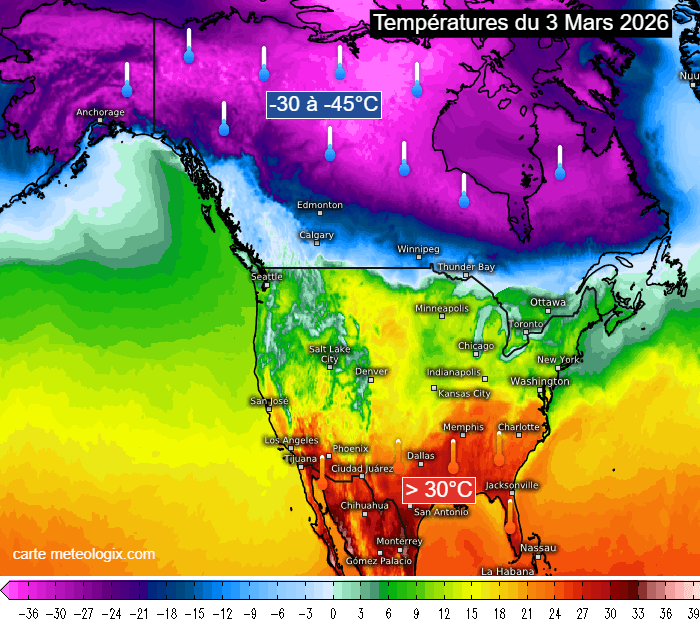 Températures en Amérique du Nord ce mardi 3 mars 2026 - meteologix.com