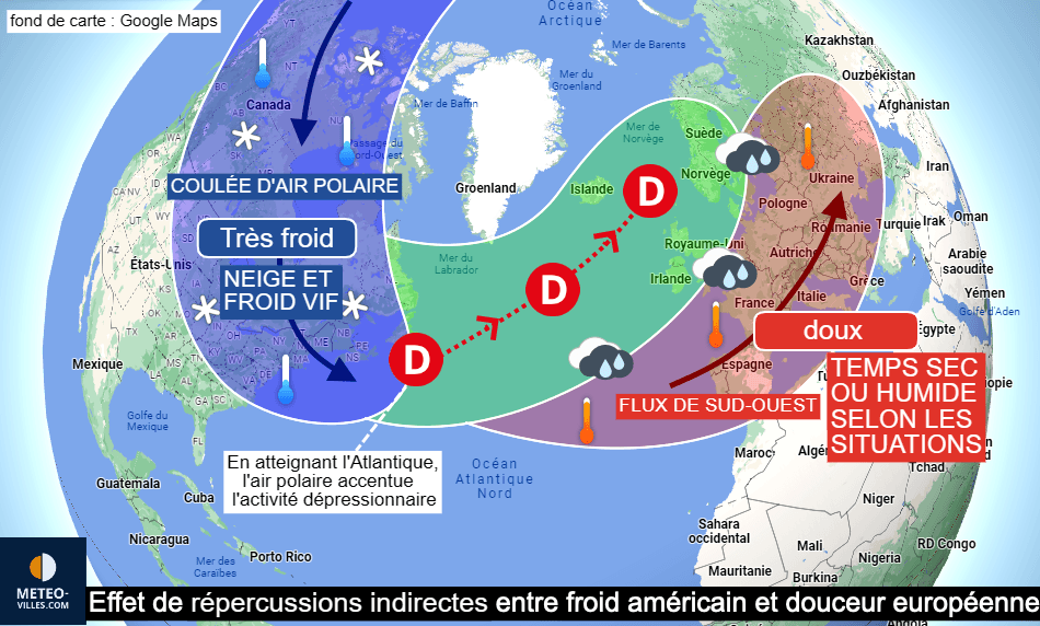 Schéma montrant l'effet de répercussions indirecte entre froid américain et douceur européenne - Météo Villes