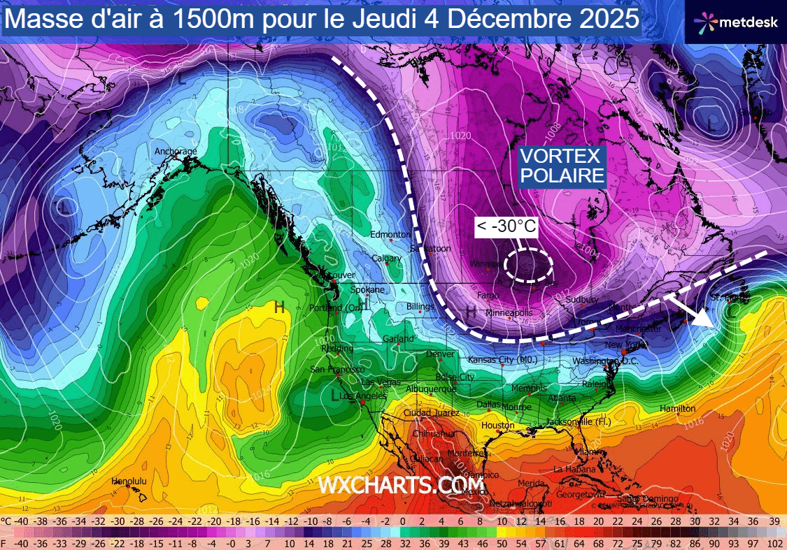 Cela se confirme : le nord de l'Amérique se prépare à l'arrivée d'une partie du vortex polaire la semaine prochaine, pour le début du mois de décembre 2025. En effet, une coulée d'air polaire va plonger sur une partie partie est du Canada et sur les états du nord-est des USA. La masse d'air prévue est loin d'être anodine : le modèle européen envisage des pointes à -30°C à 850 hPa (vers 1500 mètres d'altitude) au dessus de l'Ontario pour le jeudi 4 décembre 2025 ! De telles valeurs sont 15 à 20°C sous les moyennes de saison et sont généralement observées à proximité du pôle.