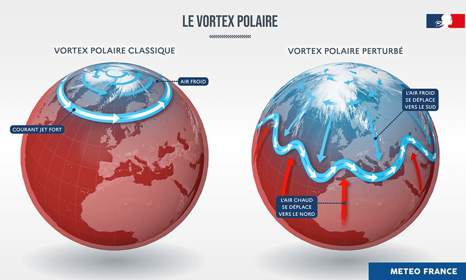 Le vortex polaire, cette vaste zone d'air froid qui circule autour de l'Arctique, est actuellement instable. De ce fait, le courant jet - qui circule d'ouest en est autour de l'hémisphère nord - tend à faiblir et à onduler davantage, ce qui peut entraîner des décrochages d'air polaire en direction des latitudes tempérées. C'est ce qui s'apprête à se produire sur le nord de l'Amérique. Un vortex polaire augmente donc les risques de coulées froides sur l'Amérique mais aussi en Europe, même si le climat plus océanique de l'Europe rend les coulées froides moins intenses qu'au Canada ou aux États-Unis.