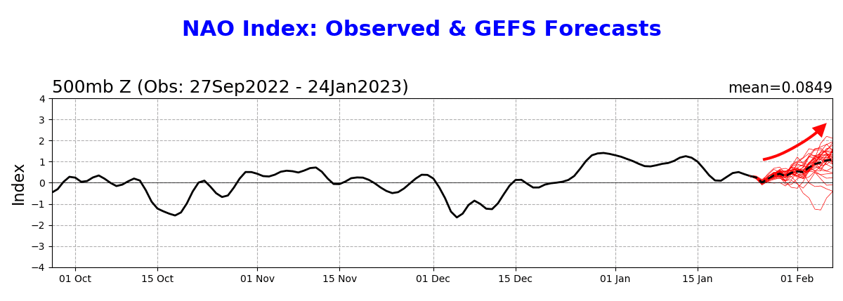 Modélisation de l'indice d'oscillation nord-atlantique jusqu'à début février 2023 - via NOAA