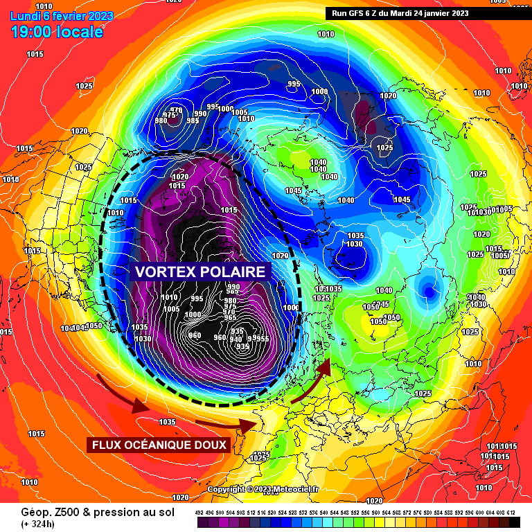 Modélisation du vortex polaire pour le lundi 6 février 2023 - via meteociel.fr