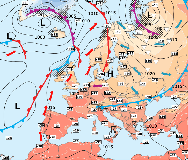 + La chaleur sèche en provenance d’Afrique du Nord a donc envahi une bonne partie de la France, limitant ainsi l’instabilité et le risque d’orages.