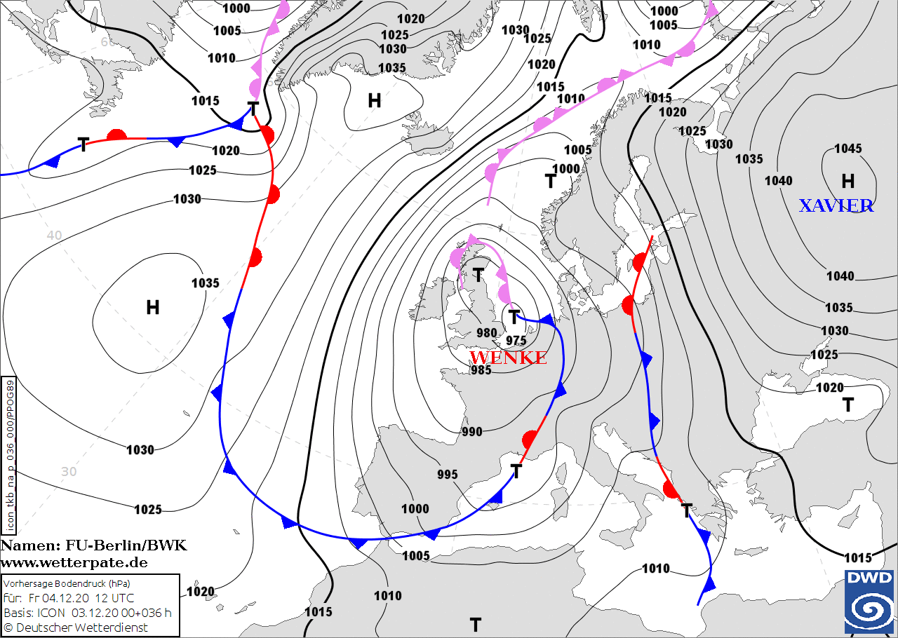 Noms des dépressions et anticyclones prévus pour vendredi 4 décembre 2020 à midi (Berlin)