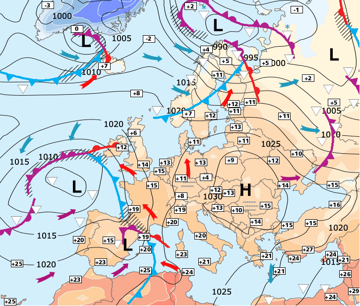 + A l'exception de la baisse des températures de jeudi sur la moitié Nord, la persistance de ce courant méditerranéen maintiendra des valeurs élevées pour la saison.
