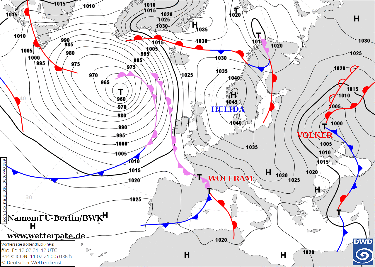 Noms des dépressions et anticyclones prévus pour vendredi 12 février 2021 à midi (Berlin)