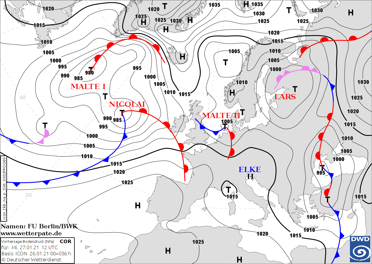 Noms des dépressions et anticyclones prévus pour mercredi 27 janvier 2021 à midi (Berlin)