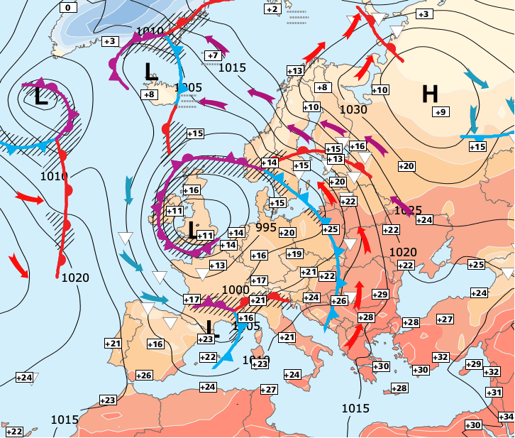 Noms des dépressions et anticyclones prévus pour lundi 5 octobre 2020 à midi (Berlin)