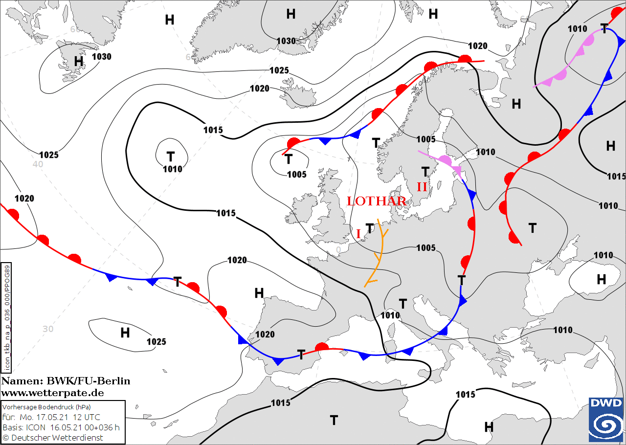Noms des dépressions et anticyclones prévus pour lundi 17 mai 2021 à midi (Berlin)