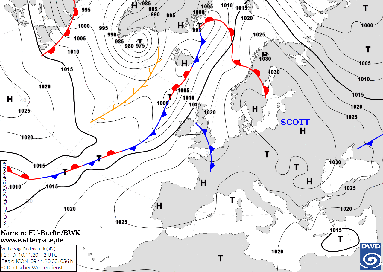 Noms des dépressions et anticyclones prévus pour mardi 10 novembre 2020 à midi (Berlin)