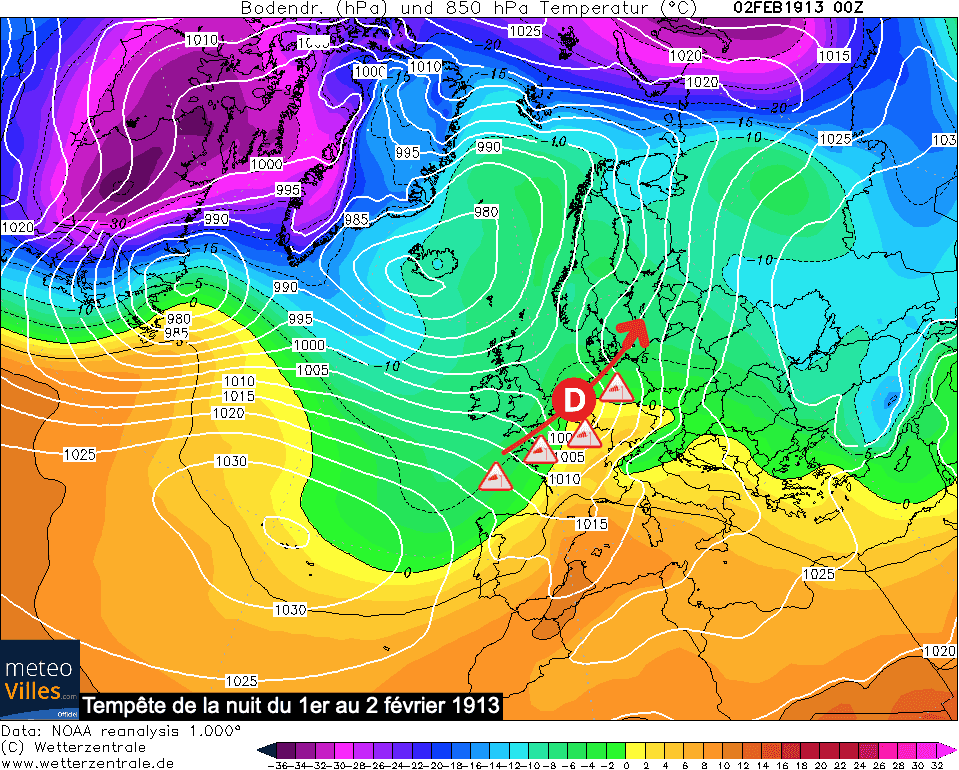 Nuit du 1er au 2 février 1913 : Une tempête tout Nord-ouest de la France car une dépression se creuse à l'entrée de la Manche et circule très rapidement vers le nord-est.